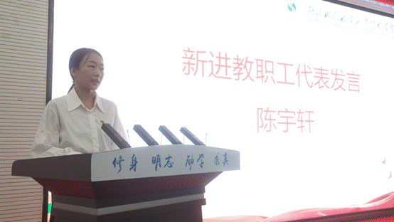 新进教职工代表陈宇轩、2022-2023年度“学生最满意教师”代表王金玲、荣休教职工代表肖志鹰依次发言,分享教育初心和育人理念。