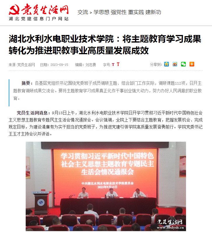 9月15日,湖北党建信息门户网站党员生活网转载我院新闻《学院将主题教育学习成果转化为推进职教事业高质量发展成效》。