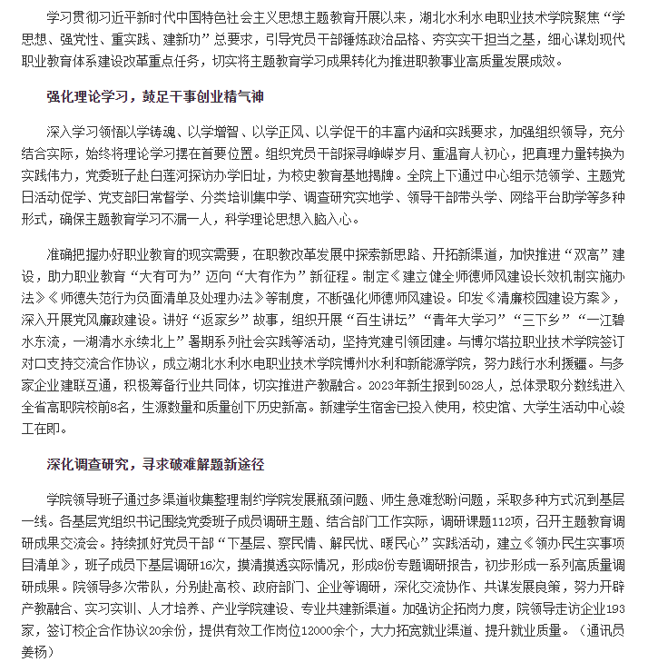 学习贯彻习近平新时代中国特色社会主义思想主题教育开展以来,湖北水利水电职业技术学院聚焦“学思想、强党性、重实践、建新功”总要求,引导党员干部锤炼政治品格、夯实实干担当之基,细心谋划现代职业教育体系建设改革重点任务,切实将主题教育学习成果转化为推进职教事业高质量发展成效。