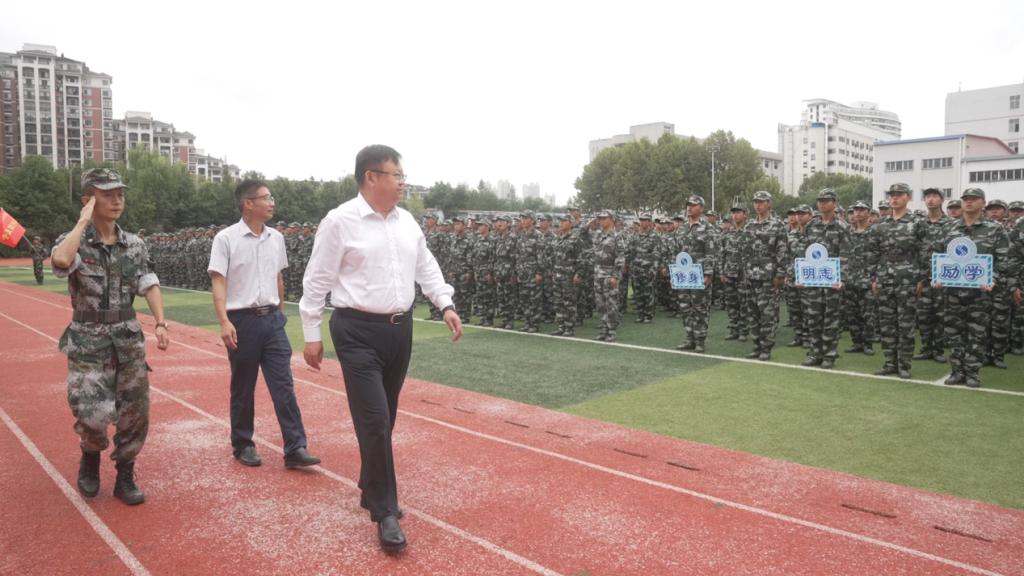 大会在庄严的国歌声中拉开序幕。王玉才、姚祖军分别在承训部队教官的陪同下检阅了两校区的学生方队。随后的分列式表演中,2023级新生们身着迷彩军装,英姿飒爽、意气风发,以整齐划一的方队、铿锵有力的步伐依次走过主席台,尽显蓬勃朝气与青春活力。全体新生齐声高唱《强军战歌》,传达水院学子永远跟党走的坚定信念和强烈的爱国报国之情,以实际行动高质量完成军训第一课。