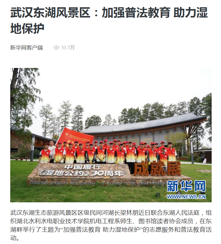 近日,新华网报道我院教师、武汉东湖生态旅游风景区区级民间河湖长梁林朋,联合东湖人民法庭,组织我院师生举行主题为“加强普法教育 助力湿地保护”的志愿服务和普法教育活动。