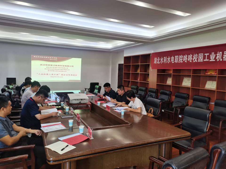 (戴华 邵军)7月12日,我院机电工程系在南湖校区机电楼会议室召开 “工业机器人英才班”校企合作推进会。学院党委委员、副院长黄泽钧,机电工程系负责人、工业机器人专业负责人和部分教师、武汉咚咚英才教育科技有限公司负责人参加了会议。