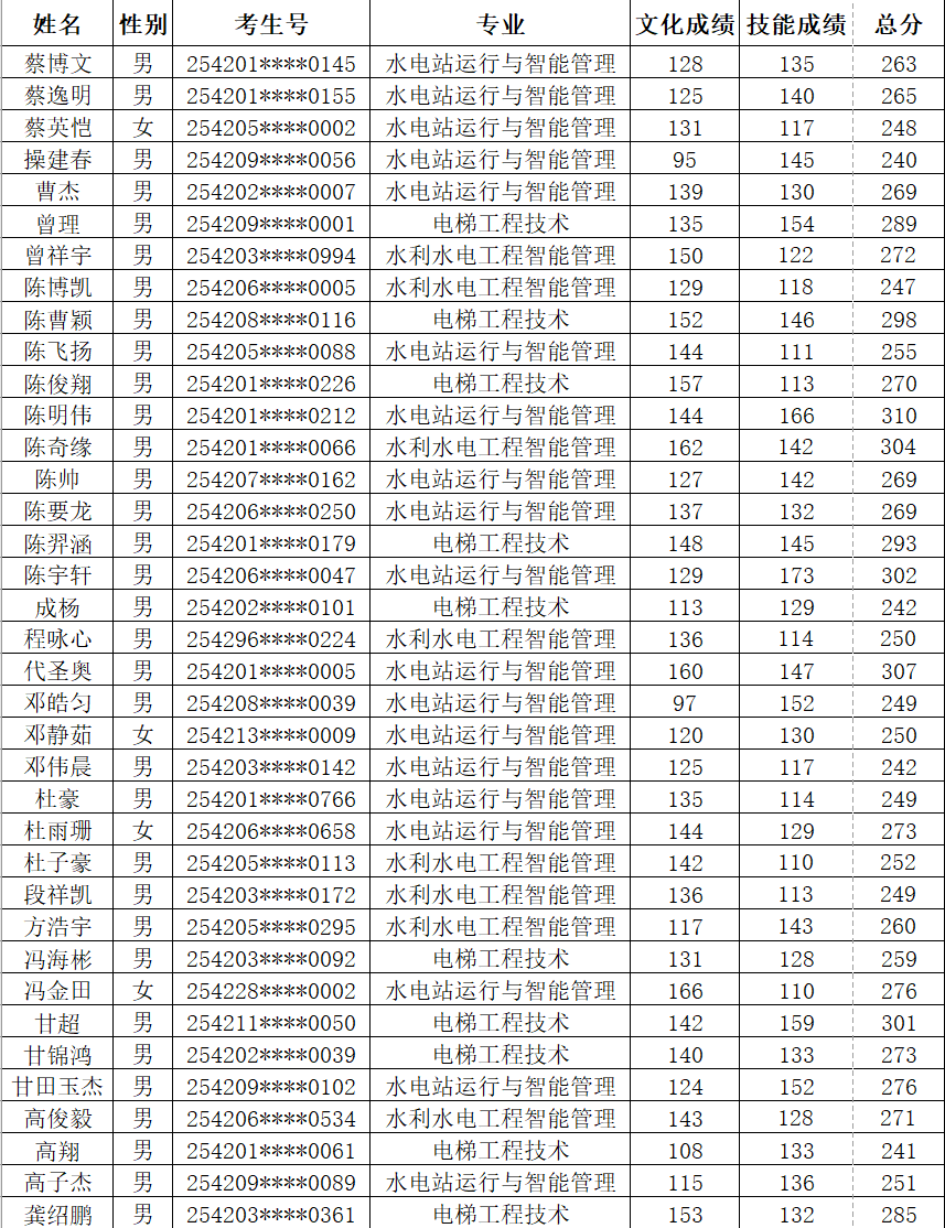 根据《省教育厅关于做好2025年高职单独考试招生工作的通知》(鄂教职成函〔2025〕3号)文件精神。按照《湖北水利水电职业技术学院2025年高职单独招生章程》中公布的录取标准和录取办法,确定各专业拟录名单并予以公示(按照考生姓名排序)。公示期为4月7日-13日,公示期内如有疑问,及时与我校招毕办联系。经我校公示录取的考生,不得参加今年后续普通高校招生统一高考、技能高考以及其他考试和录取。最终录取结果以省招办审核通过的名单为准。咨询电话:027-87378093 监督电话:027-87378279。