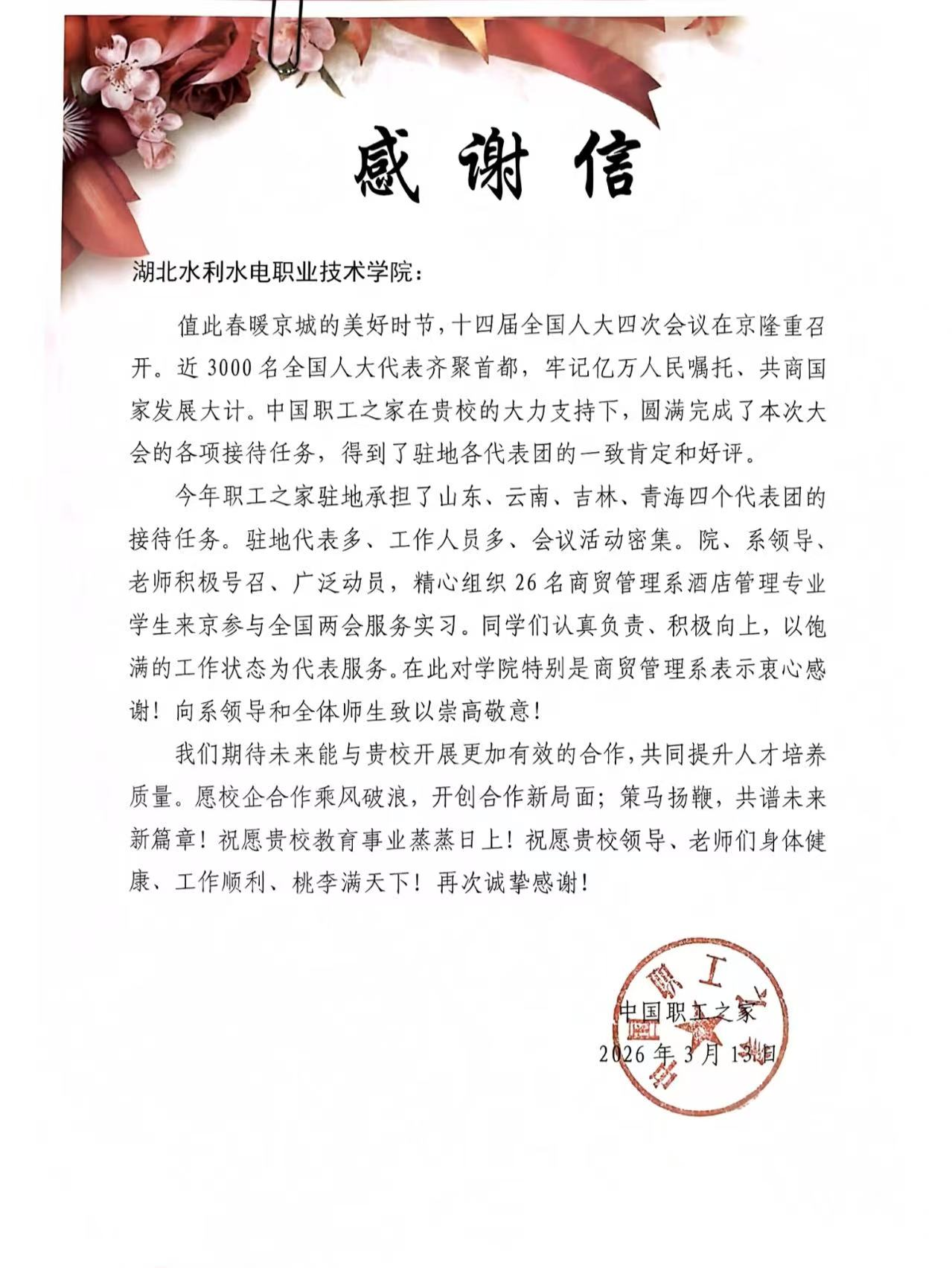 近日,中国职工之家向学院致感谢信,高度肯定我院商贸管理系酒店管理专业26名学生在十四届全国人大四次会议期间的服务工作,对学院全力支援全国两会服务保障任务表示诚挚感谢。