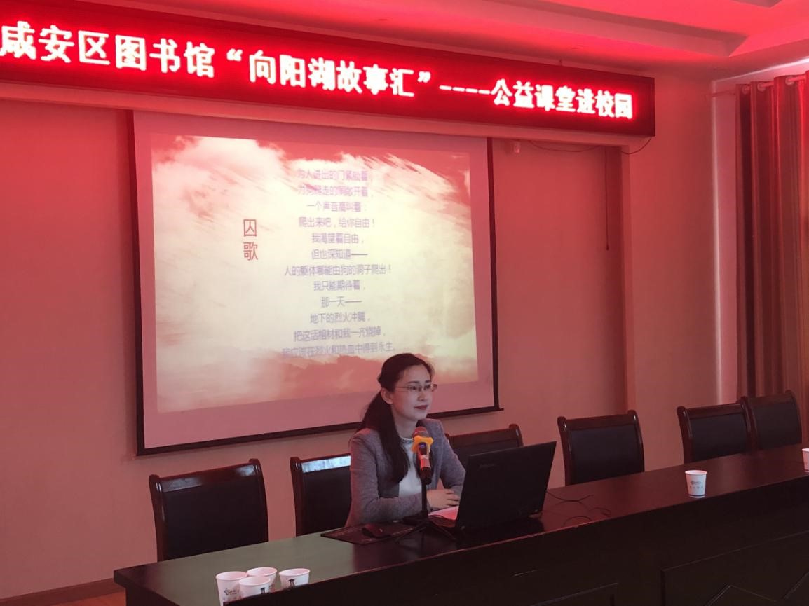 仪式上,我院思政课部周园老师在“向阳湖故事汇”公益课堂——“品红色经典、明时代精神、立报国之志”环节,以“为什么我们可以读到很多种类和许多优秀的书籍?”和“繁华背后的历史,你们知道吗?”两个问题为切入点,从红色经典的概念、“红色经典”故事选读、弘扬新时代的民族精神等三个方面展开讲述,并现场与同学们进行了生动活泼的“红色经典”知识问答互动。