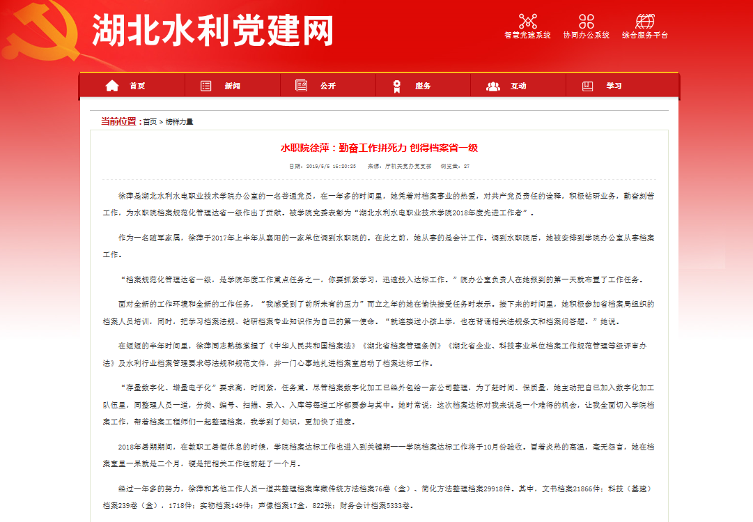 (范黎来)近日,湖北水利党建网“榜样力量”刊发文章《水职院徐萍:勤奋工作拼死力创得档案省一级》,报道我院办公室档案员徐萍同志的事迹。据悉,徐萍同志为湖北水利党建网“榜样力量”栏目今年推出的第一人。