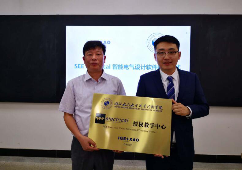(朱光波)5月24日上午,我院与IGE+XAO集团共建的“see electrical授权教学中心”在电力系实训楼举行了揭牌仪式,并进行了第一期培训,来自湖北16所职业院校的骨干教师参加了培训。我院党委委员、副院长黄泽钧与IGE+XAO中国分公司总经理杨旭共同为教学中心揭牌,并分别做了发言。